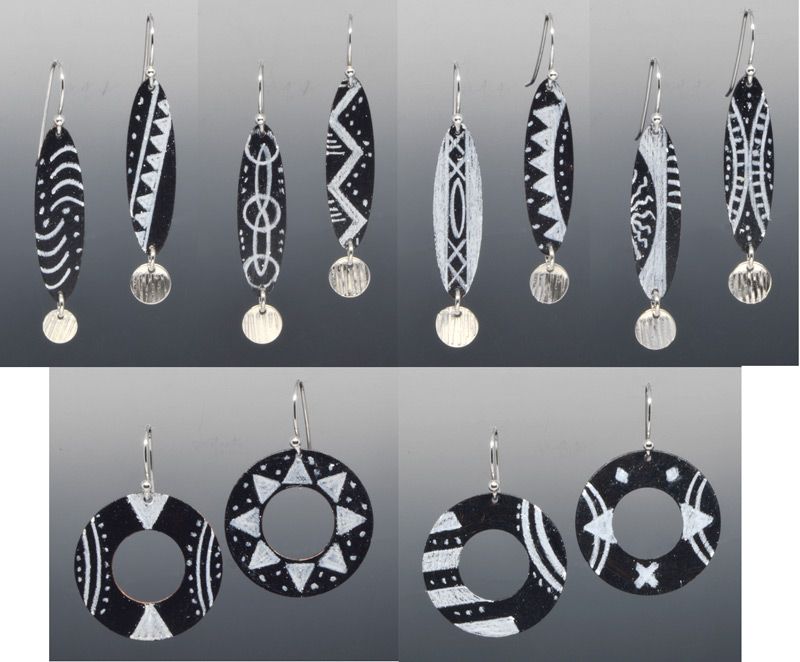 I will show you how to add the colored pencil to metal, how to prepare textured settings in silver or copper, how to rivet the metals together, how to make earwires, and how to patina your textured metal.